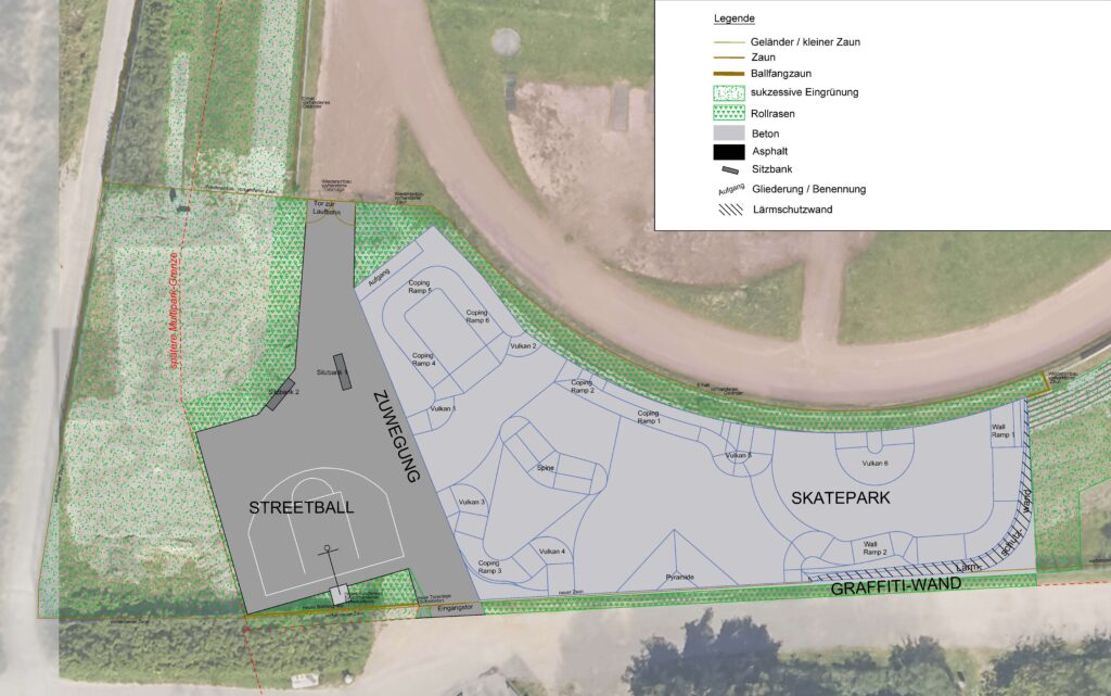 Die Planung hat sich daher wie im nachfolgenden Plan dargestellt weiterentwickelt: westlich des Skateparks wird ein vorhandener Streetballkorb aufgestellt, auf der vorgelagerten Asphaltfläche werden Linien aufgebracht und Sitzmöglichkeiten ergänzt.