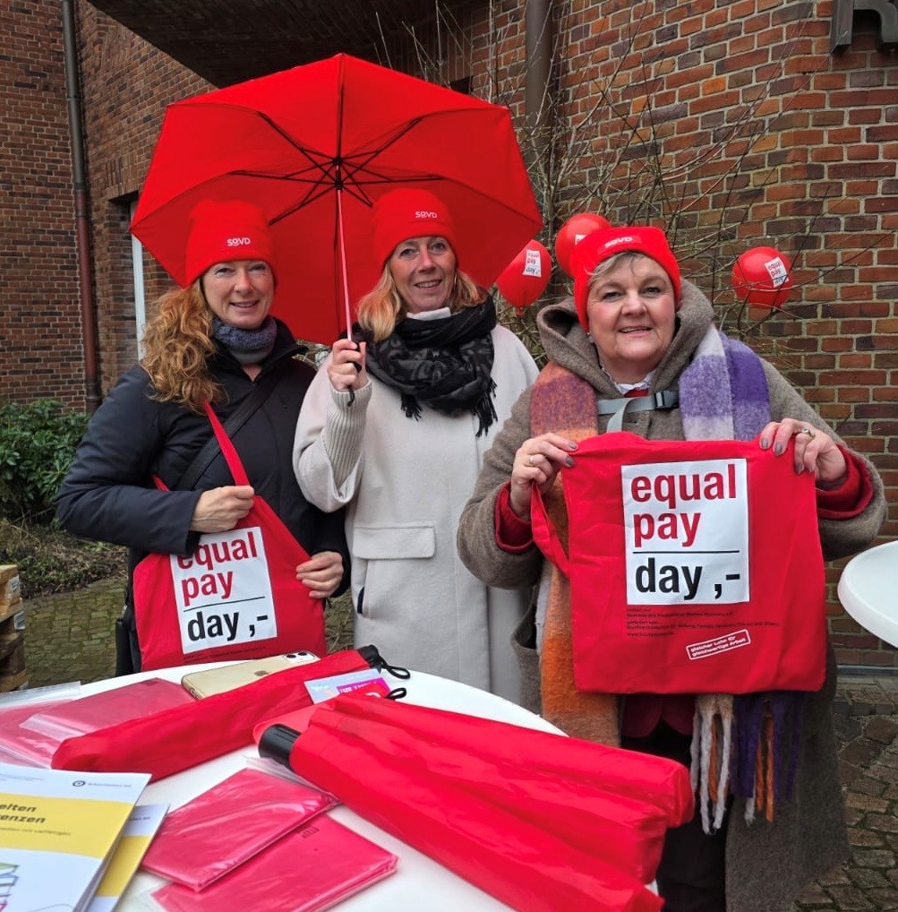 Auch in diesem Jahr machten die Gleichstellungsbeauftragten im nördlichen Nordfriesland mit Andrea Dunker (Gemeinde Sylt), Christine Friedrichsen (Amt Mittleres Nordfriesland), Sylke von Kamlah (Amt Südtondern) gemeinsam mit dem Kreisverband des SOVD Johanna Voigt und Renate Schramm vom Ortsverband Niebüll auf die Lohnlücke aufmerksam.