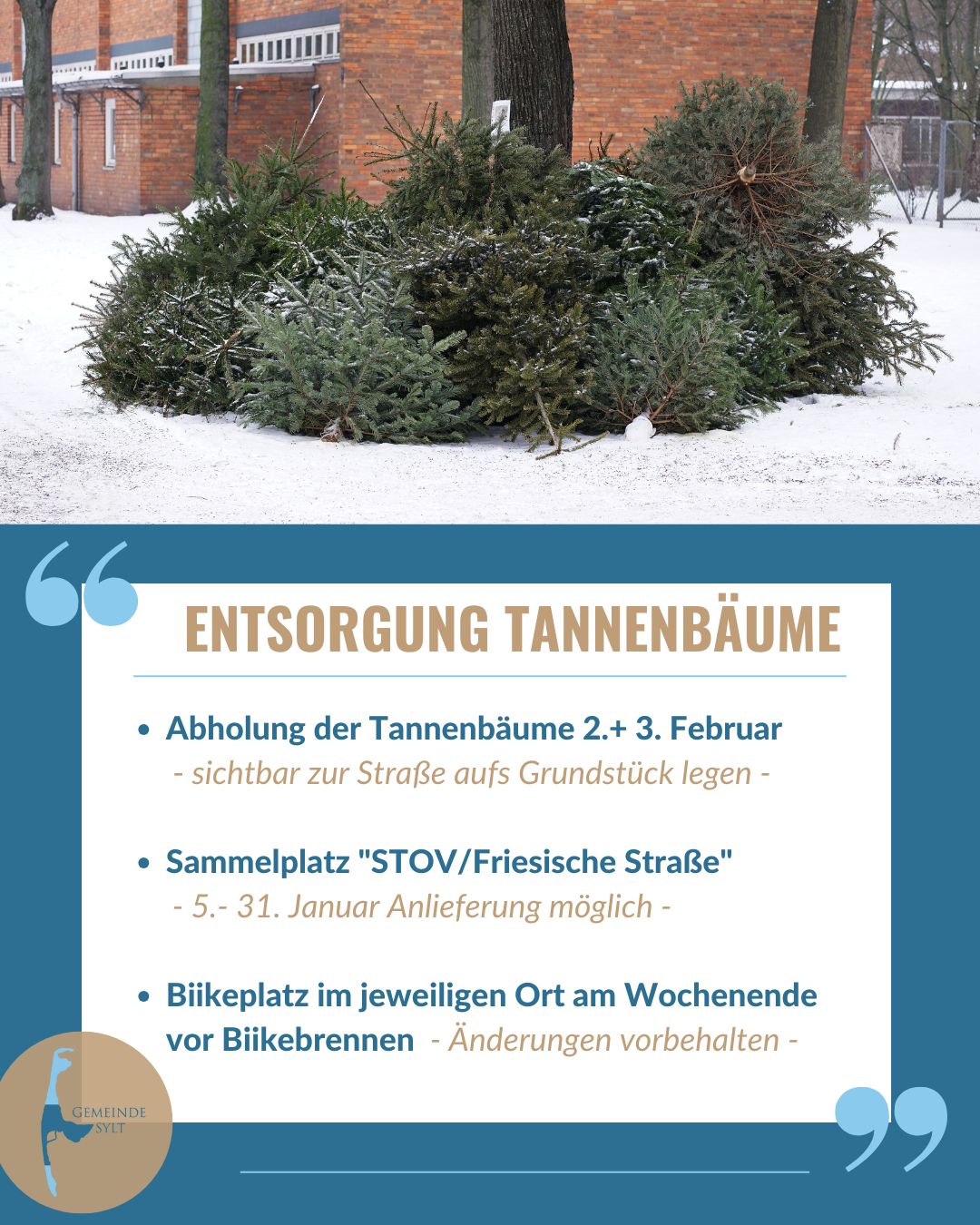 Die Gemeinde Sylt bittet darum, die Bäume erst am 1. Februar 2026 deutlich sichtbar an die Straße zu legen und dafür zu sorgen, dass weder Passanten noch der Straßenverkehr behindert wird.