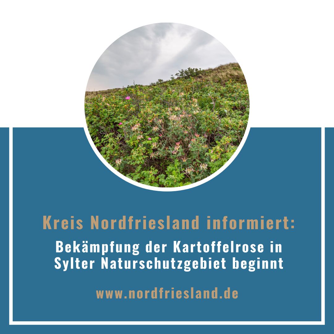 Die Kartoffelrose (rosa rugosa) stammt ursprünglich aus China und ist eine invasive Pflanzenart. Sie bedroht auf der Insel Sylt insbesondere die charakteristischen Küstendünen- und Heidelandschaften, indem sie die artenreiche Pionier- und Heidevegetation verdrängt.