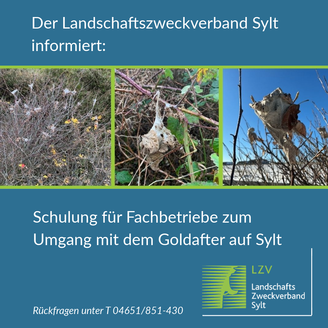 Mit dem Angebot möchte der Landschaftszweckverband Sylt dazu beitragen, die fachgerechte und sichere Bekämpfung des Goldafters auf der Insel weiter zu stärken. Die Teilnahme an der Schulung ist keine Voraussetzung für eine mögliche spätere Beauftragung im Rahmen von etwaigen Bekämpfungsmaßnahmen.