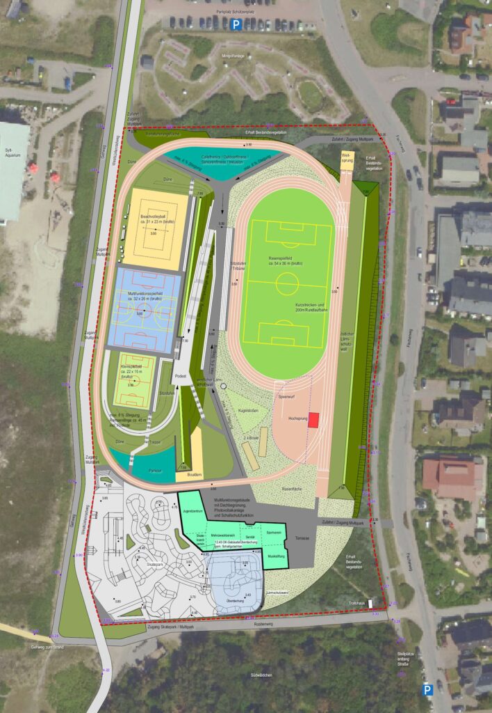 Auf der Fläche des Sylt-Stadions soll künftig der Multipark entstehen. Mit unterschiedlichen Sport- und Freizeitangeboten soll der Bereich aufgewertet und neu gestaltet werden und so das Angebot für Sylter und Gäste verbessert werden.