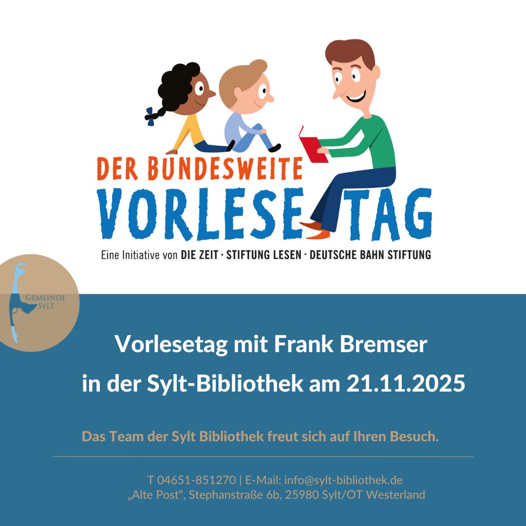 Das Team der Sylt Bibliothek freut sich auf einen Nachmittag mit Kindern, Großeltern, Eltern und Freunde voller Geschichten, Lachen und Lesefreude. Alle sind herzlich eingeladen, den Vorlesetag in der Bibliothek mitzufeiern.